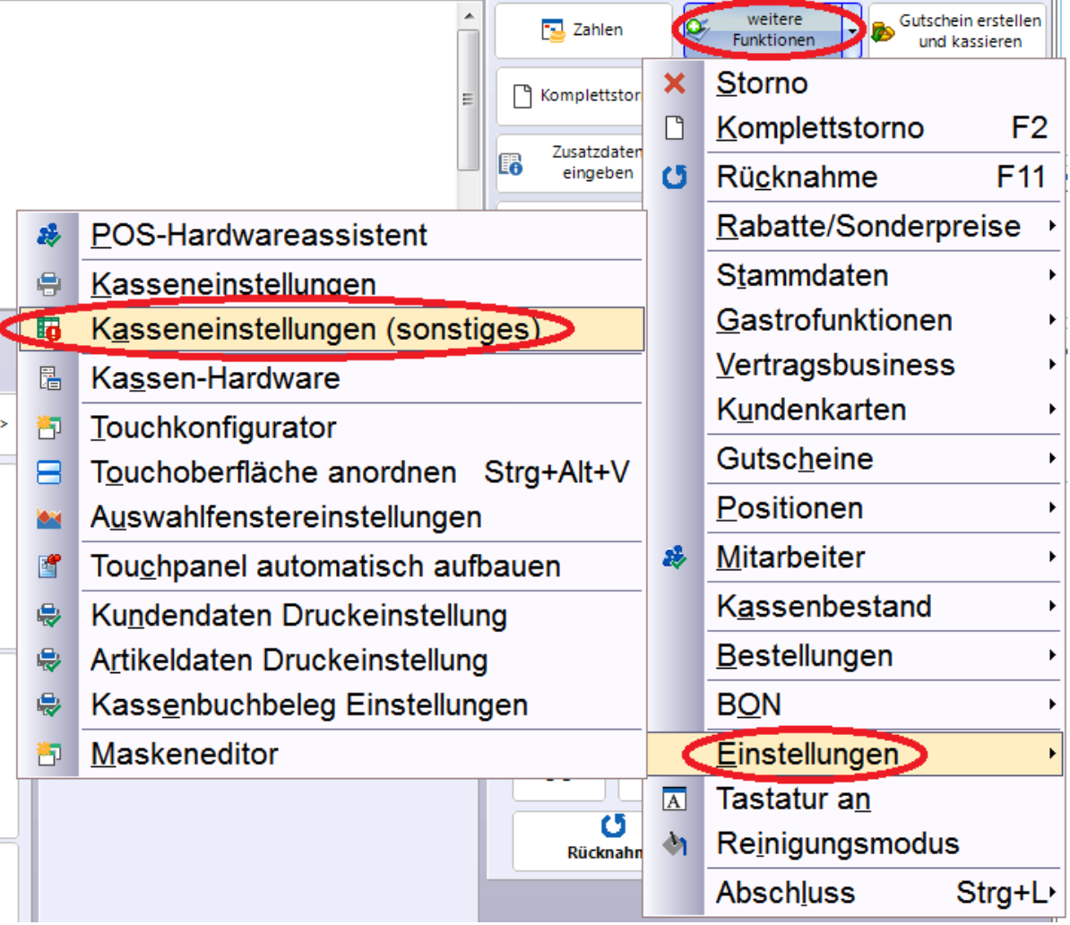 Gehen wie folgt in die „Kasseneinstellungen (sonstiges)“ (an jeder rot markierten Stelle, einmal mit der linken Maustaste klicken)